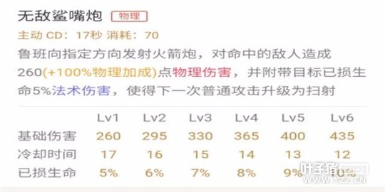 技能解析:鲁班的特色技能,抢红、抢蓝、抢龙、抢人头、甚至连小野怪都能抢。自带一个小终结,敌人血量越少,伤害越高。基本无视护甲的。这样的一个神技,肯定有不足的。2技能的释放是需要预判的。在对线期,看到其它路的队友和对面刚起来了就直接对准地图上的头像一炮轰过去,有很大概率会收到人头或者蹭个助攻。
