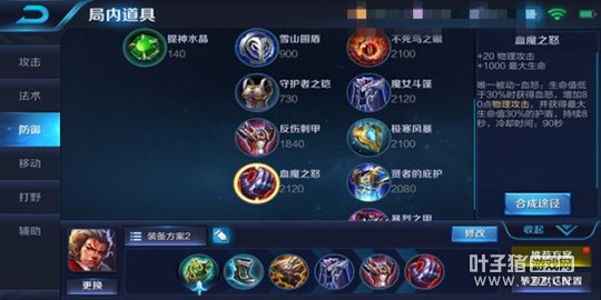 血魔之怒提供了20点物理攻击及1000点生命值,被动生命低于30%时提供大量护盾及80点物理攻击,配合上大招提供的护盾能让张飞肉到飞起。要注意的是装备被动有90秒冷却,后期时在装备处于冷却可更换其他装备,如贤者的庇护(提升容错率)甚至输出型装备。