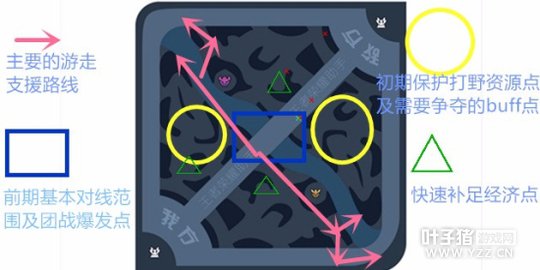 中期游走前提是将兵线推过敌方防御塔下,选择去敌方激进的那一路去支援队友gank成功率更大。初期敌人爆发不会太高,加上队友在身旁,二技能踩伤害留人并非不可,有大招的存在敌人想要逃跑很难。值得一提的是,若对方中路英雄