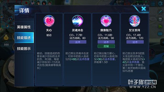 技能造成的伤害能减少目标的法术抗性,共3层。在装备没有成型的前期,妲己可以利用被动打出高额的技能伤害。玩家除了要提高自身技能命中率外,还需要考虑技能的释放顺序,力求在叠满三层被动后,再选择释放大招打出收割效果。
