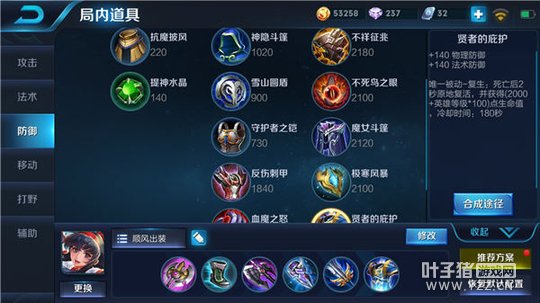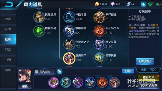 这是一套半肉装备,有较高的坦度不易被击杀。不死鸟之眼获得法术抗性和生命值加成,并且装备还能提升二技能的回复效果,在关键时刻反杀敌人。反伤刺甲获得巨额的护甲值,能将自身受到的物理伤害一部分以法术形式返还给攻击者,主要针对敌方的射手英雄和物理刺客。