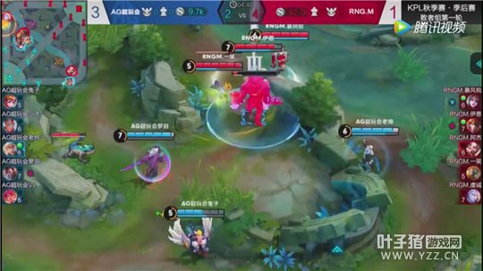 在蓝色方达摩被击杀后,红色方英雄趁势追击,在蓝色方下路野区处展开团战。李白在暴君刷新处利用一技能穿越墙体,并通过普攻野怪触发被动效果,解封三技能,利用三技能大范围消耗蓝色方英雄生命值,最后利用一技能的第三段回到原地,安全撤退。