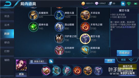 出装思路:这是一套常见的芈月半肉半输出的出装选择,前期以伤害输出为主,后期防御装备配合芈月自身超强的吸血能力,保证了自身的生存能力。第一件选择噬神之书强化芈月的吸血能力,法术攻击和冷却缩减让她能够更快速的清兵发育。第二件选择抵抗之靴增加韧性,提升芈月的机动性和支援能力。第三件做出痛苦面具可以让芈月不断通过被动消耗敌人,法术穿透则让她对敌方前排英雄也能造成可观的伤害。随后做出核心防御装备不死鸟之眼,除了增加法术防御和最大生命外,不死鸟之眼的回血效果大大提升了芈月的续航能力,让她成为战场永动机。后期增加芈月的双抗,不祥征兆让芈月可以黏住敌人,魔女斗篷则提高芈月的生存能力。