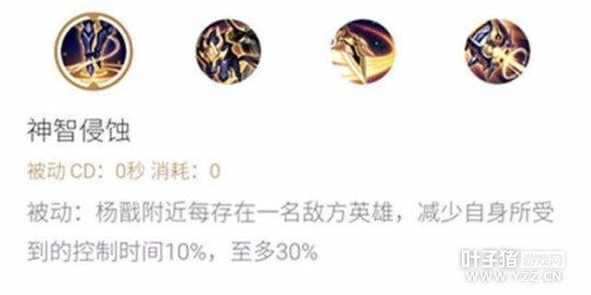 解析:在当前控制为主的版本中,杨戬作为一名近身型战士,在团中不可避免的会受到许多控制,有时候,自身技能和伤害都还没有打出来就被敌方击杀,而此被动在敌人越多的时候就会减少被控时间,能让杨戬迅速解除控制技能,打出自己应有的伤害。
