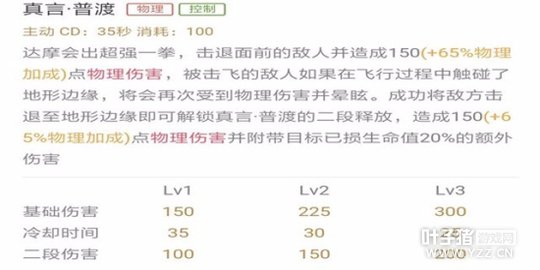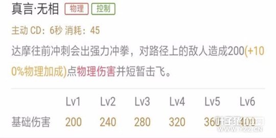 整体解析:达摩主要的位移技能,也是一个提供击飞效果的控制技能。这个技能给予达摩很强的gank能力,同时给达摩提供追击和逃命能力。一技能短暂的冷却时间,使得达摩成为一位很灵活的战士。