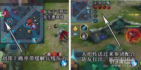 在中期开始有防御塔破除的情况下刘邦就可以适当的选择一条边路单带一下兵线压力,此时便是一个位置互换,让比较强势的上单战士或输出核心的射手与打野一起做一些小抱团入侵或是压线拆塔,此举叫四一分推,即边路一个给对手兵线压力,另外四人在其他地方做节奏运营,此时如果敌人不来人守线那么该路兵线便会慢慢的深入渗透,一旦开团刘邦便可以利用大招及时赶到队友身边支援参加团战,而如果敌方选择一人过来守边线那么在核心团战的位置敌方便会少人,此时抓准时机大招支援队友强行逼迫敌方打一波四打五的团战,做到打敌方一波小团灭或是强行拆塔。