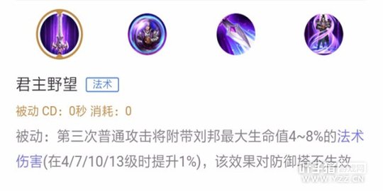 技能解析:该被动所造成的伤害为法术百分比伤害,而在游戏对战中无论是英雄还是野怪小兵(小兵无防御,炮车与主宰先锋有)的基础法防都是偏低的,所以这让刘邦可以无需去出攻击装备也能有不俗的伤害与清线能力。