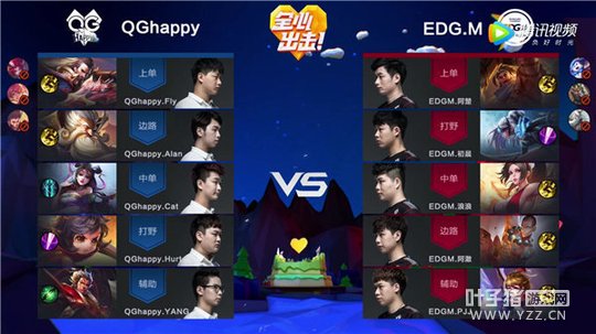 蓝色方QGhappy:上单曹操、边路老夫子、中单貂蝉、打野李元芳、辅助张飞。
