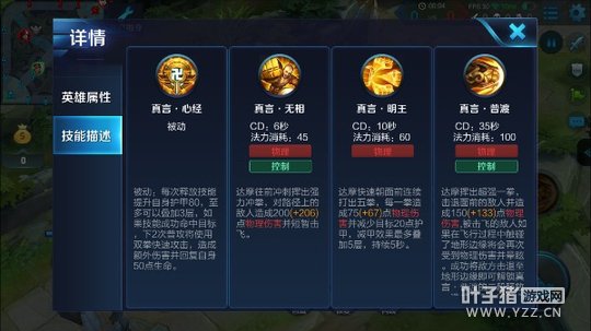 真言·明王:达摩向前连续打出数拳,每拳对目标造成物理伤害并减少物理护甲。该技能对脆皮英雄的威胁巨大。本身脆皮英雄没有太多的护甲值,一旦被达摩该技能全部命中,造成的伤害将是致命的。