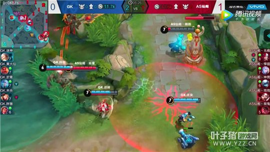 游戏开局之后双方都比较保守,没有大规模入侵敌方野区,但是AS仙阁的吕布和曹操却直奔GK红buff野区,试图骚扰马可波罗打红buff,虽然没有反野成功,但却足足拖慢了敌人拿红的进度有半分钟之久,这对马可波罗的发育情况有着很好的限制作用。
