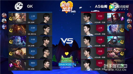 在比赛进入到后期阶段,AS仙阁的韩信在收掉主宰后,凭借己方强大的优势接着开打暴君,虽然主宰buff对暴君有着降低伤害的作用,但韩信的全攻装备伤害确实高,没过多久就拿下了暴君,在此期间吕布和扁鹊一直在野区蹲守,GK阻挠未果,只得选择放弃。之后AS仙阁带着下路主宰先锋开始拆塔,一路势如破竹最终推掉了GK的水晶,AS仙阁获得本场胜利。