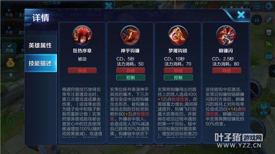 一技能-神乎钩镰:百里玄策进行一段位移,并使下三次普攻变成中远程钩镰攻击形态,被钩镰远端攻击到的目标将造成物理伤害,当外镰命中敌人会造成减速效果,而自身将获得加速效果。在钩镰链中的状态下,百里玄策可将目标向自己位移的终点拉动一段距离。