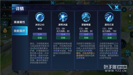 二技能-禁锢寒霜:王昭君引领寒霜之力,在短暂延迟后,能将范围内的敌人冰冻,并造成法术伤害。被动:王昭君对冰冻的敌人会造成额外的法术伤害。