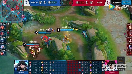 比赛进行到2分05秒,此时第一个暴君刚刚刷新,韩信与张飞已经赶到暴君处准备动手,可以看到韩信已经达到了四级,而对面的打野李元芳却还只有三级,因此eStar完全没有争夺暴君的资本,最终EDG.M也凭借着打野的等级优势顺利收掉暴君。