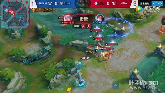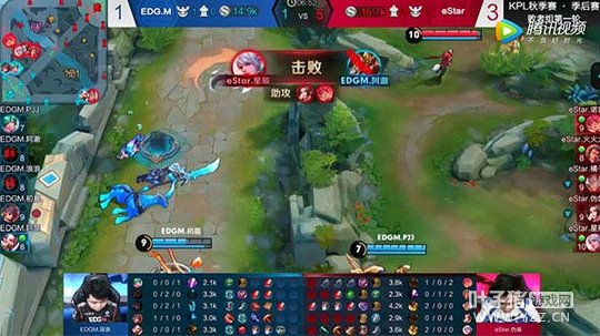 比赛进行到5分05秒,EDG.M在推进eStar中路一塔时,被eStar不知火舞直接先手,双方爆发团战。庄周与貂蝉的与队友脱节,此时百里玄策没有选择利用二技能输出,而是选择不断走A打出伤害,最终eStar打出一波0换2,百里守约也收获到一个击杀。