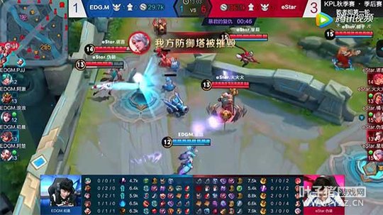 比赛进行到12分53秒,eStar在抱团推进中路后直接转到上路,百里玄策利用自己的普攻射程优势,不断在外围点塔,最终成功推掉敌方上路高地,eStar的优势也进一步扩大。