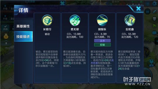 一技能-思无邪:蔡文姬能持续为自身和周围队友回复生命值,并提升自身移速。