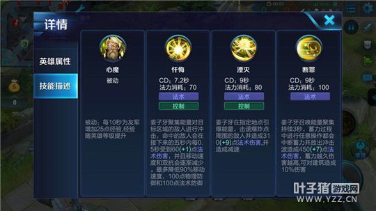 被动-心魔:姜子牙每隔一段时间会为友军增加经验,英雄的等级越高,获得的经验值也将越多。