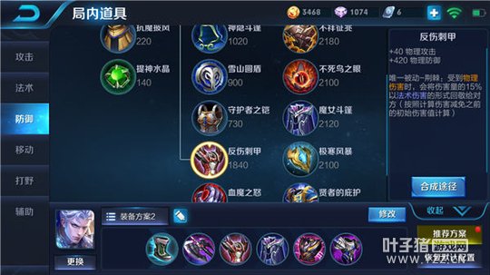 出装:抵抗之靴+暗影战斧+反伤刺甲+魔女斗篷+暴烈之甲+霸者重装