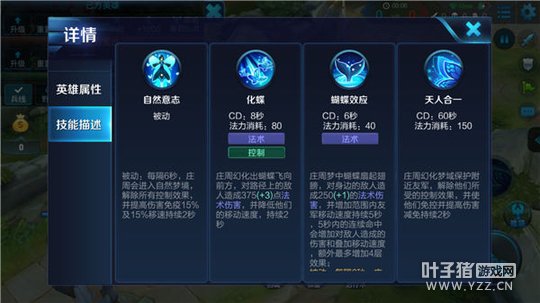 被动-自然意志:庄周每隔一段时间会进入自然梦境,并解除所有的控制效果、提高伤害免疫,并获得移速加成。