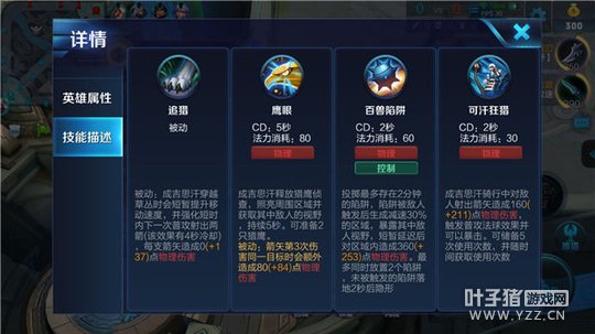 总结:成吉思汗是一名攻强守弱的射手英雄,游走能力和发育速度都非常出色,尤其擅长对付隐身的英雄,但由于缺少位移技能,生存能力较差,需要队友进行一定的保护。