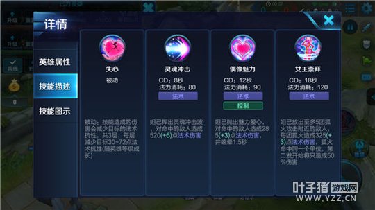 被动-失心:妲己的技能造成伤害后,会减少目标的法术抗性(叠加有上限),并随英雄的等级成长而增加减少的法术抗性,这也是妲己能打出高额伤害的重要因素。