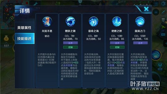 在许多时候辅助英雄是团队的领导者,因为不需要补兵,辅助可以对游戏全局有整体把握。大乔的每个技能都有很强的功能性,为友军加速的被动技能,击退敌人的一技能,使队友快速回城的二技能,持续沉默效果的三技能以及迅速集结队友的大招。大乔无论是保护队友时还是带领队友发起进攻时都非常给力,再选择一套合理的出装,敌人一定会对你恨之入骨。