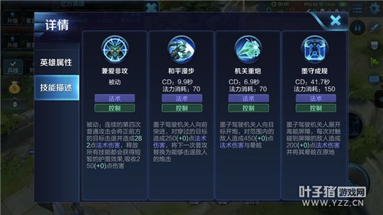 二技能-机关重炮:墨子驾驶机器人向指定方向开炮,对命中目标造成法术伤害与晕眩效果。