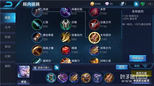 六神装推荐:抵抗之靴+暗影战斧+宗师之力+不祥征兆+魔女斗篷+无尽战刃