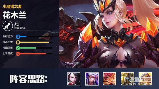 主要特点:这是一套爆发伤害非常恐怖的阵容,团战可以直接依靠伤害碾压敌人。花木兰是这套阵容中唯一的前排英雄,花木兰只需要依靠自己的重剑形态抗住足够的伤害,为队友提供足够的输出环境即可。
