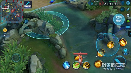 女娲在四级之后可根据战场局势选择前往支援,三技能赋予女娲极强的支援能力,在锁定过程中会有一个位移标识,可据此选定位移的终点,而自身在释放技能时,应尽量观察自身周围的环境,以免被敌方控制而中断位移,可在中路靠野区的草丛中隐藏自己,再进行施法。