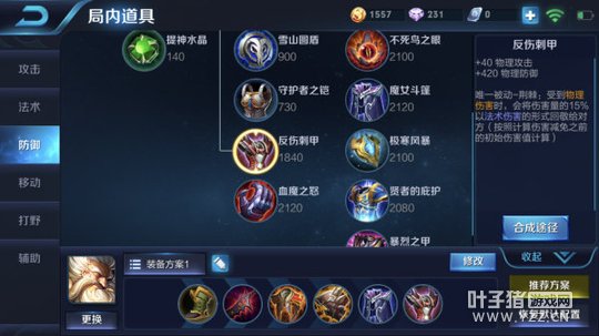 推荐理由:边路单带六神装,不仅输出能力爆表,防御能力也十分强悍,后期敌方不来多名英雄根本防不住老夫子的单带。首先选择影忍之足,提供的物理防御让老夫子在前期有一定的抗压能力,对线期间如果面对的是敌方双人线老夫子安心发育即可。随后做出末世这件输出装,攻速和物理吸血加成极大的提高了老夫子的输出和续航能力。在有了末世之后,老夫子可以选择出防御装备来强化后期的生存能力。红莲斗篷、不祥征兆、魔女斗篷、反伤刺甲这四件装备从各方面提升了老夫子的防御能力,团战中老夫子既可以选择单带,也可以选择参团去打控制和吸收伤害,装备成型后的老夫子可以说没有任何一个英雄敢与他单挑。