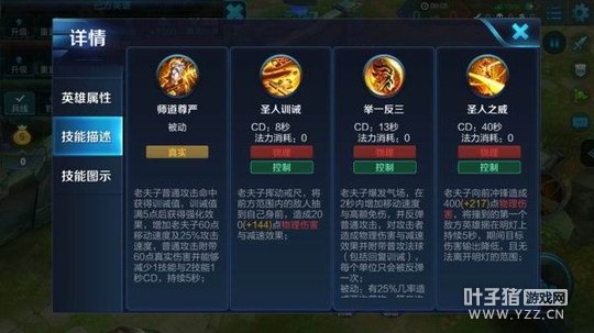 解析:一技能让老夫子有不错的控制和留人能力,通过一技能的控制减速效果老夫子可以轻而易举的黏住敌方脆皮英雄,让他们无处可逃。