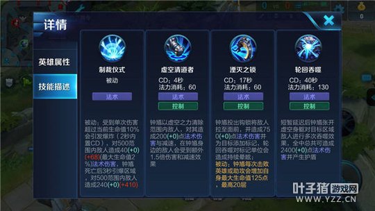 钟馗死亡后被动技能的爆炸伤害十分的恐怖,中后期可以轻松的将脆皮应打成残血,甚至大后期六神装齐全的情况下,全法术攻击装的钟馗能够轻松利用自己的被动将敌方脆皮英雄击杀,在团战中钟馗也可以利用自己被动技能的效果,当自身处于残血状态时,立刻来到敌方英雄团战的位置,并利用自己的被动技能对范围内的敌人造成大量的伤害,从而能够有效的帮助队友击杀敌方英雄。