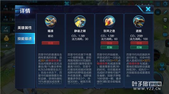 一技能-静谧之眼:百里守约在指定位置放置视野装置,并获取周围视野(视野的范围会随等级的提升而扩大),百里守约能对视野装置的范围内的野怪造成额外的伤害,视野装置最多存在三个,被敌方占领后将失效。被动:百里守约在原地不动时,可持续获得伏击效果,并增加物理穿透(可叠加,但有上限),移动后伏击效果消失。