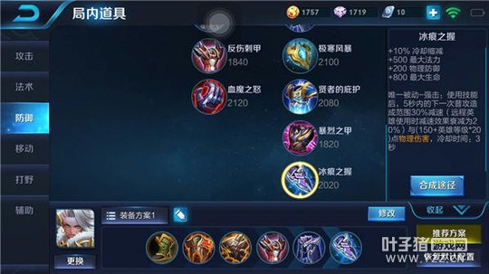 第六件冰痕之握,增加物理防御以及生命值可以吸收更多的伤害,法力值有更好的续航能力,利用一技能可以快速触发冰痕之握的被动强击,打出强化普攻制造更多伤害和减速效果,更好配合队友打出输出。