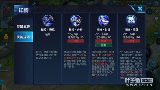 技能解析:兰陵王的大招是一个很霸道的gank技能,它可以让兰陵王进入到很长一段时间的隐身状态,而兰陵王就可趁机来进行gank。而且,二段大招也是兰陵王唯一的一个位移技能,无论是用来追击还是用来逃生都非常好用。