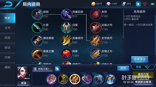 第一套出装:贪婪之噬、疾步之靴、无尽战刃、泣血之刃、破军、破甲弓