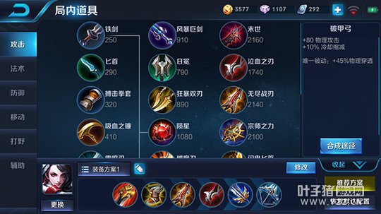 出装详解:这套出装核心思想就是前期快速发育,并提高游走GANK的能力,中期通过伤害和续航打出优势,后期只要以战场收割为主。出门首先购买狩猎宽刃,随后升级为贪婪之噬,提高前期清野的效率,随后做出疾步之靴提高游走GANK的效率,然后再做出无尽战刃配合阿轲的被动打出爆发伤害。中后期首先做出泣血之刃,提高阿轲的持续续航能力,随后做出破军、破甲弓这两件装备,提高后期战场的收割能力。