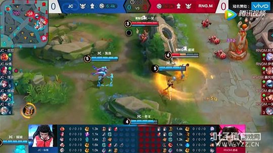 第3分05秒时,JC队员到达四级之后,再次入侵RNG.M的野区准备抢蓝BUFF,JC.纵情发现了RNGM.虔诚的马可波罗落单,直接用一技能穿墙,之后三技能打出了大量伤害并触发了击飞效果,马可波罗逃用位移技能回塔下后,被JC.浪荡的貂蝉收下人头。