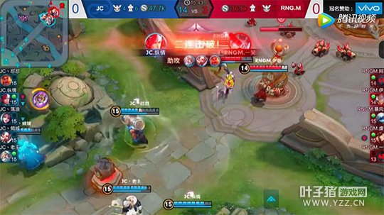 15分30秒,中路爆发团战,JC三人在正面进行牵制,韩信和苏烈从侧面发动进攻,苏烈先手控制住RNG.M的一人,韩信一技能跟上,直接一套伤害将其击杀,之后再次切入到战场上,拿下双杀,最终帮助队伍拿下了这场比赛的胜利。