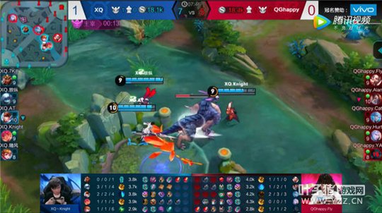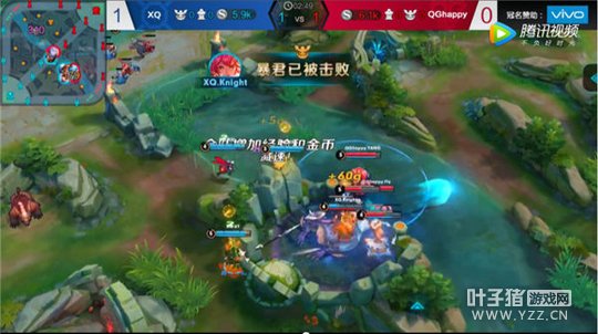 红色方诸葛亮和钟馗在中路河道草丛遭到蓝色方多人的攻击,这时候花木兰也从下路迅速赶往支援,寡不敌众的红色方选择撤退,诸葛亮因为二技能的高机动性所以成功撤退,而钟馗因为机动性较差又受到了孙膑大招的控制,无法逃脱最后被击杀。花木兰见己方状态良好,便选择攻打暴君,将己方的优势进一步扩大。