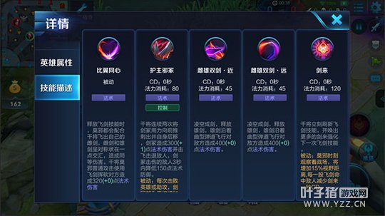 释放飞剑技能时,莫邪都会配合干将飞出自己的雌剑,雌剑和雄剑呈对称状在一点交汇,造成同等伤害。这一效果让干将莫邪可以释放更多的飞剑,在战斗中能够以数量弥补命中率的不足。