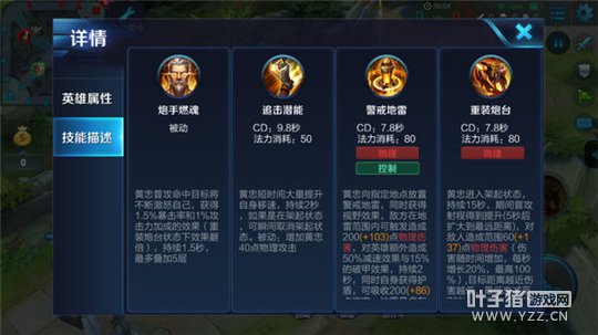 黄忠向指定地点施放地雷,同时获得视野效果,所以可以将地雷放进草丛,敌方在地雷范围内可触发造成物理伤害,对英雄额外造成减速与破甲效果,持续一段时间并赋予黄忠自身一个可以吸收伤害的护盾,此技能可以在黄忠架起状态时使用,达到牵制敌人和输出更高伤害的效果。