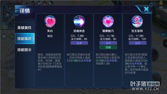 被动技能——失心:被动技能是妲己打出高额伤害的重要保证,并且等级越高,减少敌方法抗的数值越高。