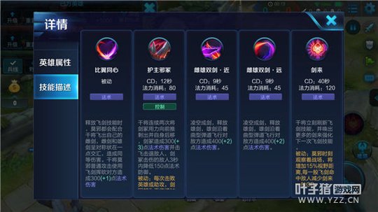 三技能-雌雄双剑·远:该技能和二技能属性相同,能对敌人造成法术伤害,但攻击范围比二技能远。