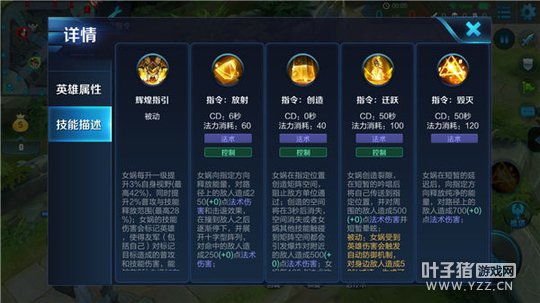 被动技能-辉煌指引:随着等级的提升,女娲会提升自己的视野、普攻和技能释放范围,视野的提升让女娲有着很强的反gank能力,在后期更是明显;普攻与技能释放范围的提升让女娲在后期有很强的消耗能力,让她在安全的位置便能轻轻松松的消耗敌人。女娲的技能伤害还会标记英雄,能给攻击标记英雄的友军或自己带来极大的增益效果。