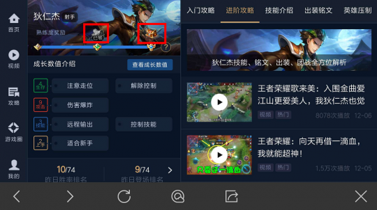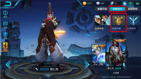 2.点击一个符合数量度要求的英雄,在右上角的“攻略技巧”进入“英雄攻略”界面: