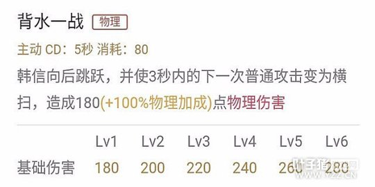 整体分析:韩信的一技能有两段,第一段释放完之后可以在5秒内释放第二段。第一段技能可以挑飞敌方英雄,算是一个小控制技能,但只有第一次拥有挑飞效果第二段没有。第二段技能释放不需要消耗法力的,并且俩次施放都能触发被动的攻速提升效果。两段技能都有一定的位移能力,而且可以穿越墙体。合理使用二段技能能够位移很长一段距离。