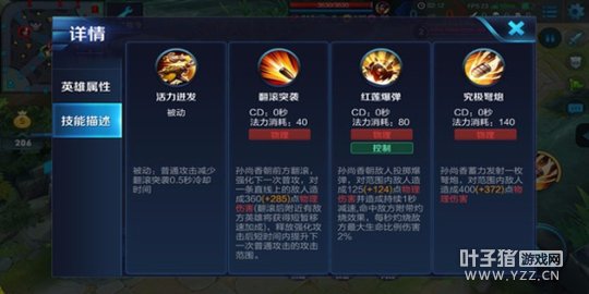 解析:孙尚香朝指定方向扔出炮弹,对命中敌人造成短时间灼烧效果和减速效果。该技能有很强的辅助作用,在追击残血时的留人作用较为明显,在逃跑时对敌人的减速也大大提高了自身的保命能力。推荐次点。